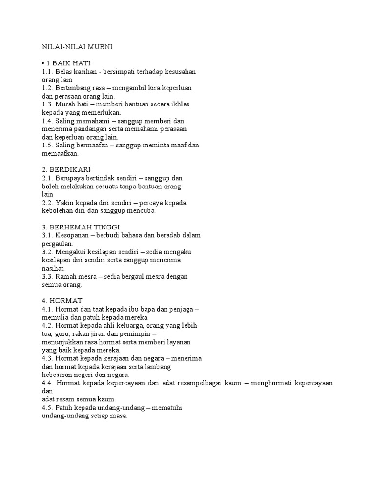 Pendidikan nilai murni ialah untuk membentuk murid-murid supaya berperibadi mulia dan mampu dalam membuat keputusan berdasarkan nilai moral diri keluarga komuniti dan masyarakat. Sebagai calon peperiksaan PT3 dan SPM pula pelajar dikehendaki mengingati nilai-nilai murni ini dan perlu menyatakannya tanpa mengubah bentuk asal nilai murni tersebut seperti menambah atau menukar imbuhan. NILAI-NILAI MORAL DAN CONTOH HURAIAN Senarai contoh huraian dibawah ini disediakan bagi memudahkan pelajar menghafal atau sebagai panduan untuk pelajar menulis huraian yang menggantikan kata kunci.